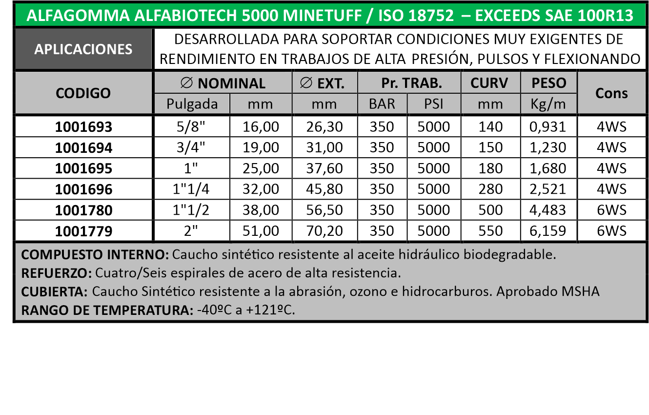 Detalles de producto Imprimir E-mail Solicitar precio Out of Stock ALFABIOTECH 5000 - MINETUFF - ISO 18752 - EXCEEDS SAE 100 R13 Haga una pregunta Add to Compare Volver a: PRODUCTOS ×Cerrar Alfagomma https://www.alfagomma.com Descripción