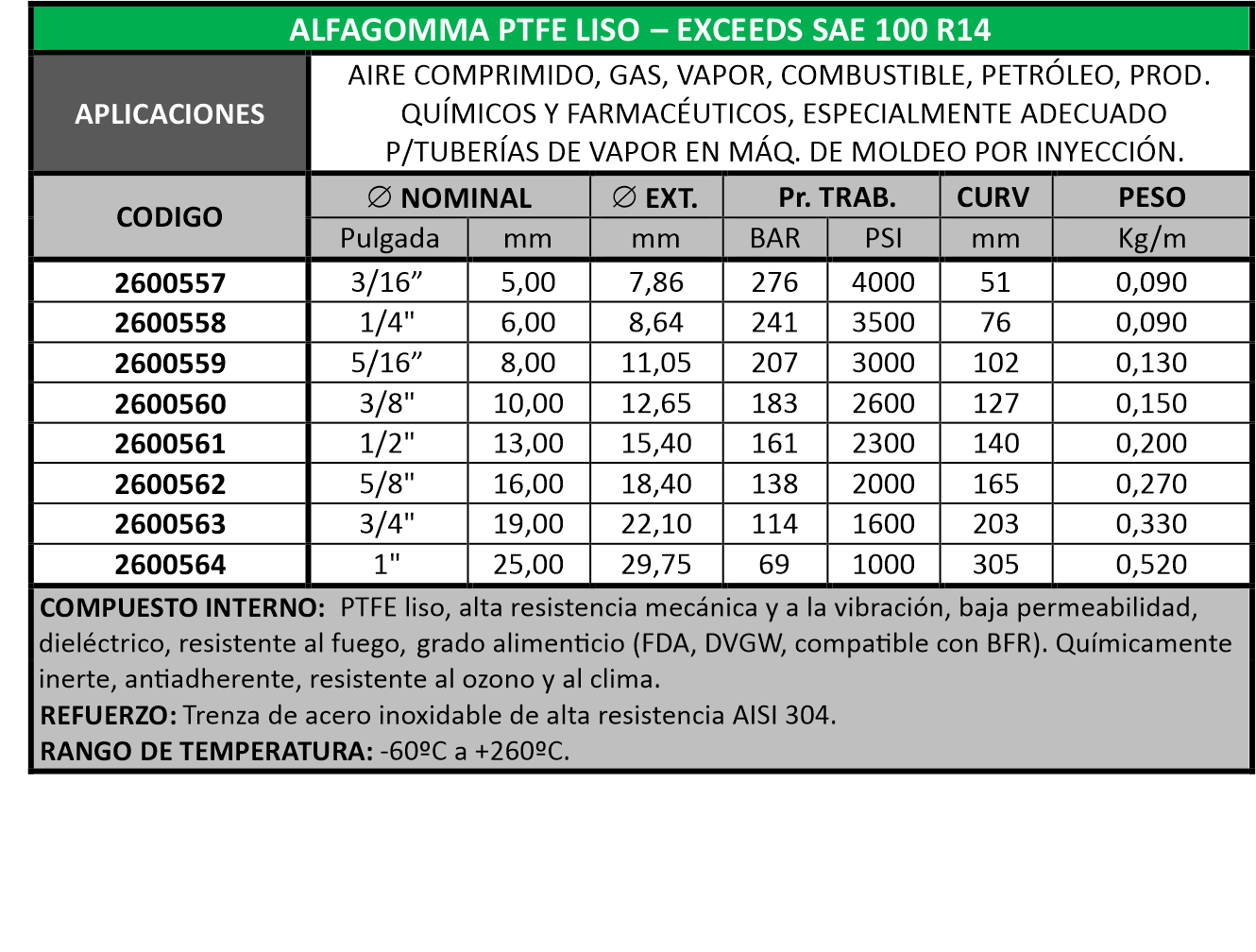 Detalles de producto Imprimir E-mail Solicitar precio Out of Stock PTFE LISO – EXCEEDS SAE 100 R14 Haga una pregunta Add to Compare Volver a: PRODUCTOS ×Cerrar Alfagomma https://www.alfagomma.com Descripción